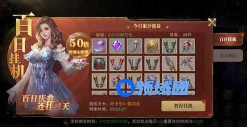 开启百日挂机后将在玩家当前解锁的最高地图最高关卡进入百日挂机状态,享有50倍经验&掉落加成