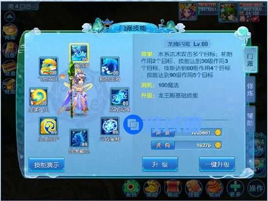 人物35级后学习,水系法术攻击敌方全体,造成伤害同时还能扣除对方80点魔法值,点技能提升法攻,所以这个技能跟龙腾一样都是首选要点的。