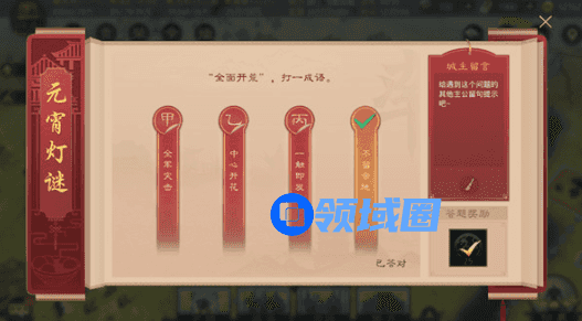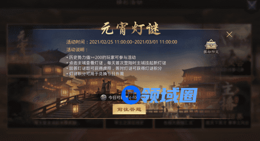 2月25日11点-3月1日11点期间,每位玩家的主城上都会挂起元宵灯笼,每盏灯笼上都有精心设计的灯谜,玩家只要登录游戏,且满足历史势力值大于200的条件,即可通过点击包括自己在内的玩家主城灯笼答题参与活动。