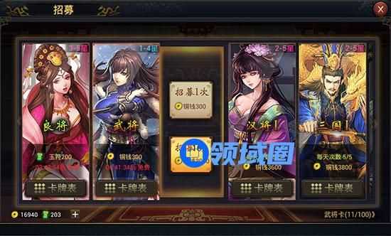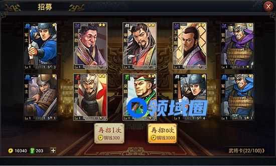 2)选择招募方式和次数即可抽取武将卡。玩家可以根据自己的需求,选择招募方式,如选择招募1-4星的武将,可以一张张来碰运气,也可以十张十张地大批量抽取。不会用到的武将卡可以转化为技巧值,提升武将的技能等级,所以玩家不用怕无用的武将卡会浪费。