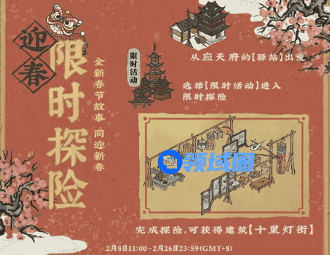 从应天府驿站出发;选择【限时活动】进入限时探险;完成探险即可获得建筑【十里灯街】!