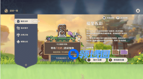 原神中1.3版本的最新活动福至五彩已经随着更新完成而开启了,这个活动需要玩家寻找指定的颜色的目标进行拍照获取不同颜色的相片,之后即可利用相片来进行福至宝匣的奖励兑换。