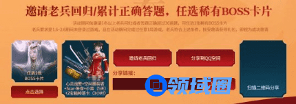 第二种:邀请老兵回归OR累计答题正确,只要邀请1.6-2.6日未登陆过的玩家,且游戏一局即算成功邀请,或者有着最强大脑的你累计答题正确36道,可任意选择一张稀有BOSS卡片,既然是稀有的,应该是通过普通答题比较难随机获得的,各位逆粉要加油,1个月的活动时间,累计答对36道题这个任务其实不算难,应该都能获得!算是白给