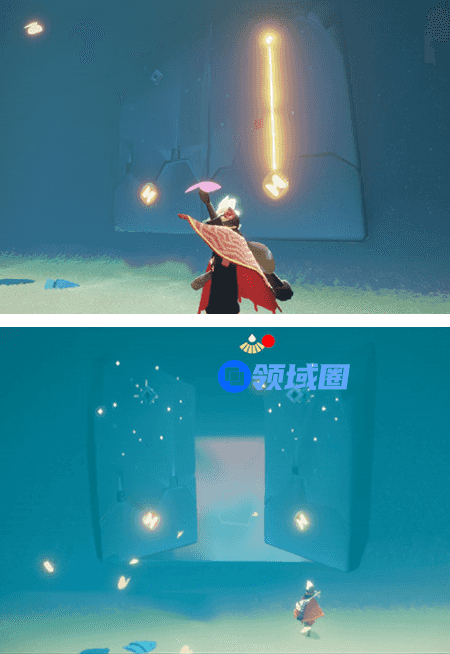 到洞穴里面来,看到有蝴蝶标记的门,需要两个人一起使用蝴蝶动作才能打开。