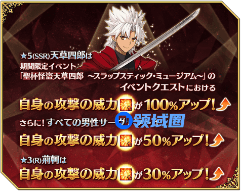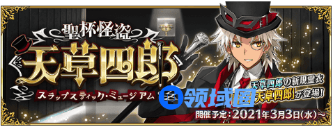 本次活动将于3月3日下午5点(算上时差,国内确实是5点)开启,活动难度不算很高,本次活动没有任何的新五星从者降临,估计就是单纯的天草的相关单UP活动。活动期间天草四郎的伤害增加100%,所有男性从者伤害增加50%,荆轲伤害增加30%。