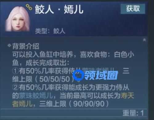 有50%几率获得能成长为更强力侍从的蒙珠鲛嫣儿,当前最高可以成长为寿天者嫣儿,三维上限( 90/90/90 )。