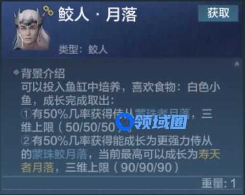 有50%几率获得能成长为更强力侍从的蒙珠鲛月落,当前最高可以成长为寿天者月落,三维上限( 90/90/90 )。