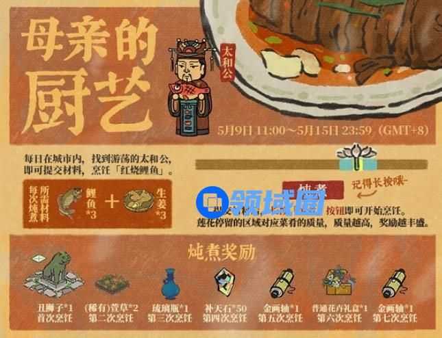 每日在城市内,找到游荡的太和公,即可提交材料,烹饪「红烧鲤鱼」。