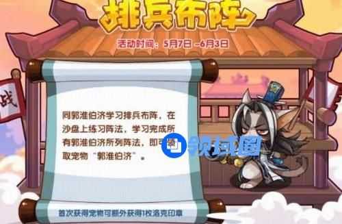同郭淮伯济学习排兵布阵,在沙盘上练习阵法,学习完成所有郭淮伯济所列阵法,即可领取宠物“郭淮伯济”。