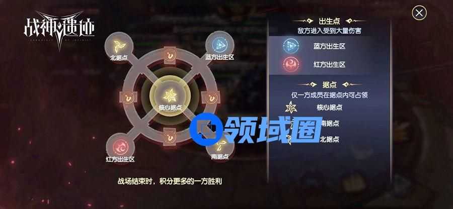 1.勇者战场分布着3处资源点,双方各有6名玩家参与资源争夺战。被占领的资源点可为占领方队伍产出资源积分。团队控制的资源点越多,获得资源积分的速度就越快。首先获得1500资源积分的队伍获胜。
