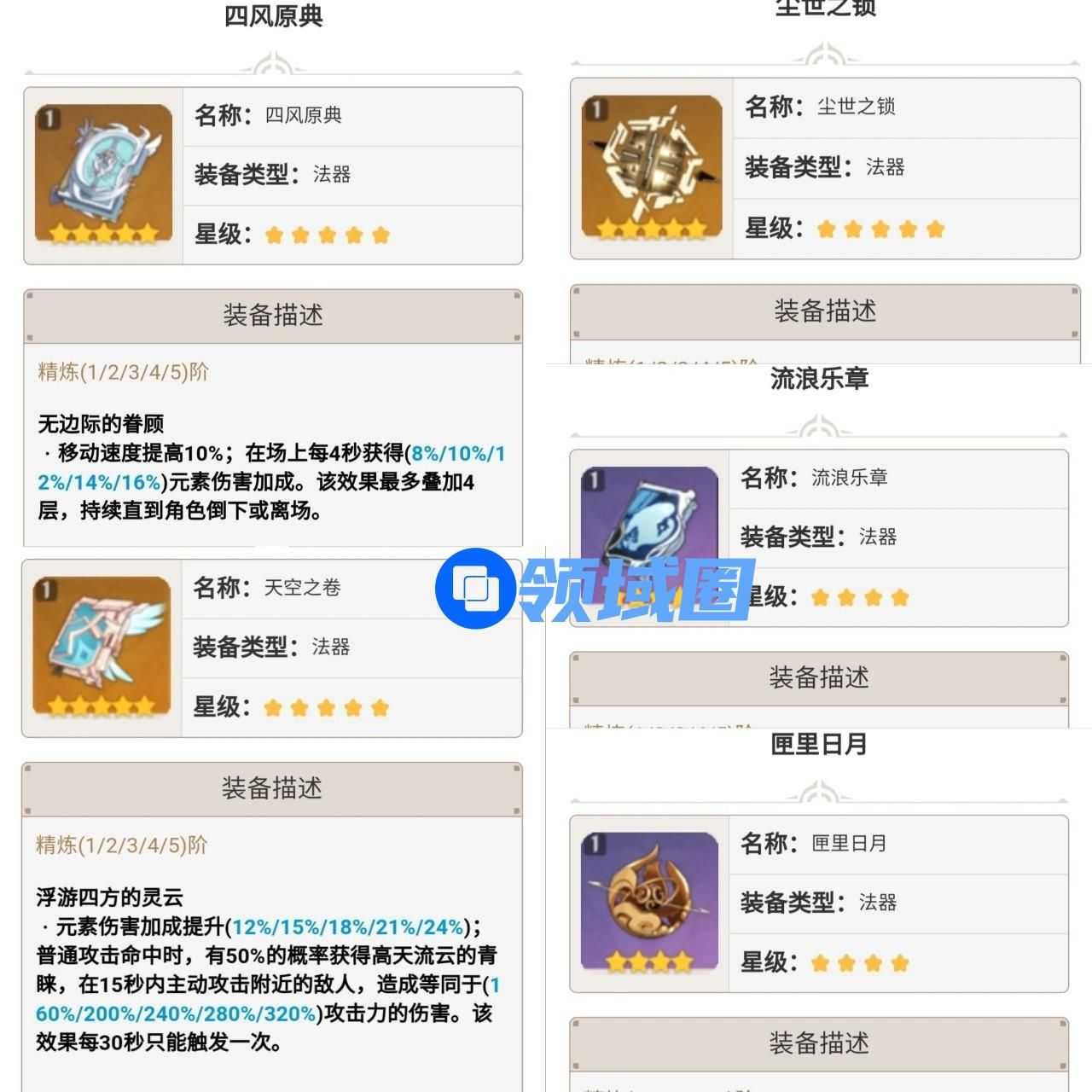 2、武器优先五星,根据暴击爆伤(50/150) 选择四风原典或天空之卷 尘世之锁不过多评论。