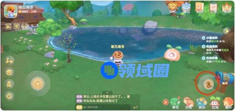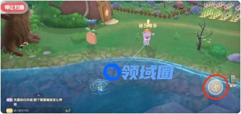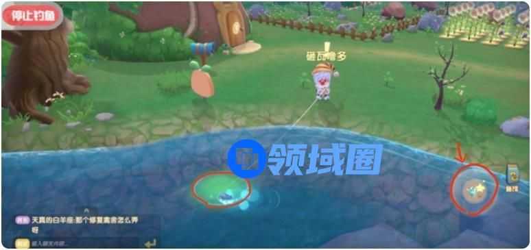 买完鱼饵后,来到可以钓鱼的地方,比较常用的钓鱼点在家园,雪山,浆果森林还有开心农场。