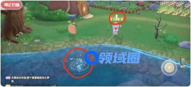 静待一小会,有鱼咬竿的时候,池子里的小拉姆鱼标会上下沉浮,溅起水花~还有我们继几的头顶,会出现一个黄色的感叹号!