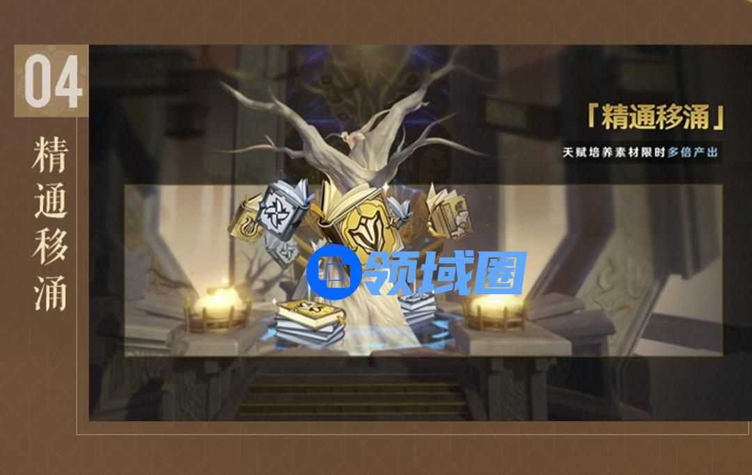 「精通移涌」活动期间,旅行者成功挑战「忘却之峡」和「太山府」天赋培养素材秘境,领取秘宝奖励时,消耗「原粹树脂」可获得双倍奖励,每天一共可享受3次双倍掉落机会。