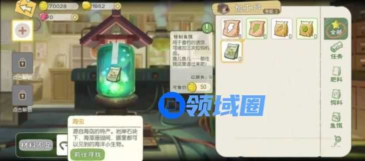4. 点击鱼饵就能查看所需要的材料,需要两只海虫,获得方法是,需要解锁海盗,去往海盗以后就可以进行捕捉海虫,这里注意海岛的资源是不会刷新的,所以需要的话就能多拿就多拿就行了!