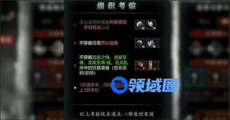 “组织考验”对通关条件提出了各种限制,譬如不穿戴指定装备,心法,或需求穿戴指定装备,心法等。欢迎对自己的实力和技术有自信的玩家前来挑战考验关卡!