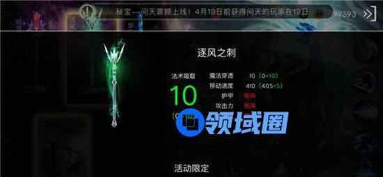 属性解析:逐风之刺提升法维安的后期作战能力,10点法术吸取更是让法爷跨入大法核时代的大门。移动速度法术吸取的生存加成,魔法穿透的输出加成,相当于4颗铂金圣石,法维安前期作战能力非常出色,配上逐风之刺,使其成为全时期强势的中单英雄。