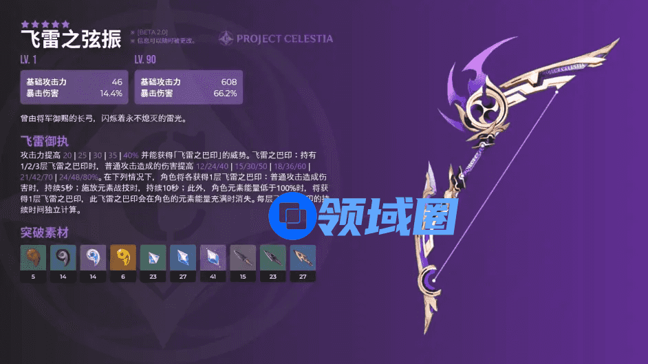 飞雷之弦振,5星弓。608基础攻击力,66.2%暴击伤害,被动飞雷御执:提升当前角色攻击力,并按照角色行为叠加印记数,获得普通攻击伤害加成。适用角色:宵宫、达达利亚、菲谢尔。哪怕忽略其被动对普攻的加成效果,暴伤属性+攻击力增幅已经挺香的,角色的最终面板数值会比较好看,达到期望伤害的培养难度大幅降低。