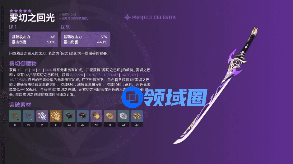 雾切之回光,5星单手剑。674基础攻击力,44.1%暴击伤害,被动雾切御腰物:提升当前角色全元素伤害,角色的指定行为会叠加印记数,获得与自身神之眼同属性的元素伤害加成。适用角色:神里绫华、刻晴、凯亚、行秋。元素爆发CD越短的角色,与该武器的相性越高,能够较长时间保存3层印记效果。