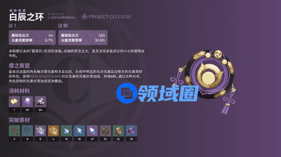 白辰之环,4星法器。565基础攻击力,30.6%元素充能,被动樱之斋宫:角色触发雷元素相关反应后,对应反应参与元素的角色将获得元素增伤。适用角色:丽莎。如何理解呢?假设,丽莎触发超载,队伍内的雷、火角色将获得元素伤害提升。