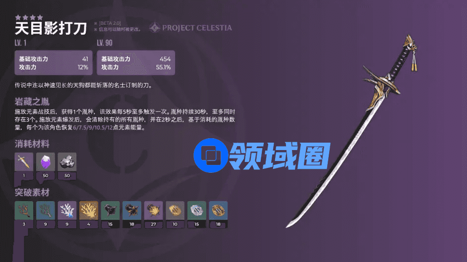 天目影打刀,4星单手剑。454基础攻击力,55.1%攻击力提升,被动岩藏之胤:释放元素战技会获得一个胤种,释放元素爆发会清除身上胤种,并获得元素能量恢复。适用角色:雷主、凯亚。元素战技低CD角色才能发挥其作用,实现不俗的能量恢复。班尼特