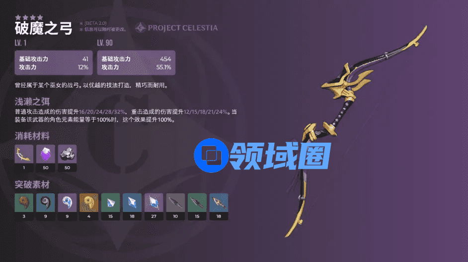 破魔之弓,4星弓。454基础攻击力,55.1%攻击力提升,被动浅濑之弭:提升角色的普通攻击与重击的伤害,当元素能量达到100%时加成翻倍。适用角色:甘雨、菲谢尔、宵宫、达达利亚。不过为了这点加成而放弃元素爆发,并非明智之选,近战普攻带弓藏、远程重击用试作澹月,术业有专攻,均衡发展两不沾略微尴尬。