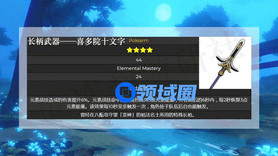 喜多院十文字,4星长柄武器。565基础攻击力,110元素精通,被动名士振舞:提升元素战技伤害,并在战技命中敌方后可获得元素能量回馈。适用角色:香菱。目前唯一可以和这些属性搭配的也就只有香菱了,在佩戴旗印套配合此武器效果,元素爆发耗能将不再是问题。