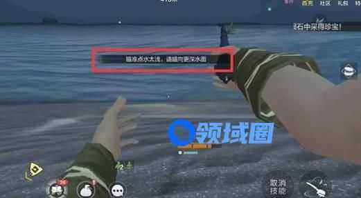 2、之后手持钓鱼竿进入垂钓状态,接着通过滑动和点击屏幕来抛出鱼竿。(如果看到瞄准点水太浅的提示,可以将视野稍微往上调一点,之后将鱼竿抛往更远的深水处)