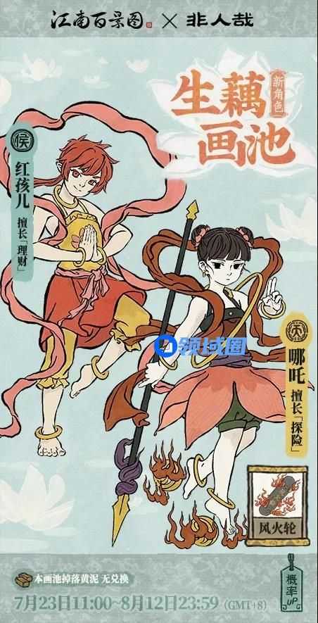 -【非人哉 • 生藕画池】开启!联动居民哪吒、红孩儿概率up。该画池内可抽取哪吒专属珍宝【风火轮】;
