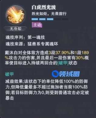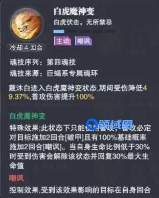 而当戴沐白的第四魂技吸收巨蝎系魂环之后将变为【白虎魔神变】,进入此状态后的戴沐白将只能进行普攻,但同时他也将获得减伤以及普攻加成,并且在【白虎魔神变】状态下对敌方进行普攻将能够对目标施加两回合【破甲】+【嘲讽】效果,并且当该魂技吸收魂环超过1万年时,使用该魂技后戴沐白将能够立即进行普攻,是关键时刻遏制敌方主力发挥的极佳技能!