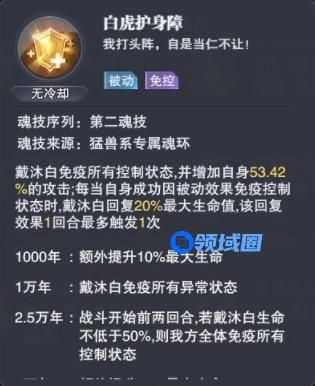 且当第二魂技吸收魂环达到1万年时他更将免疫所有异常状态,而当吸收魂环达到2.5万年时,只要在前两回合戴沐白的生命值维持在50%以上,我方全体魂师将免疫所有控制状态。可见,【白虎护身障】这一魂技将他白虎兽武魂的刚硬特点发挥的淋漓尽致!