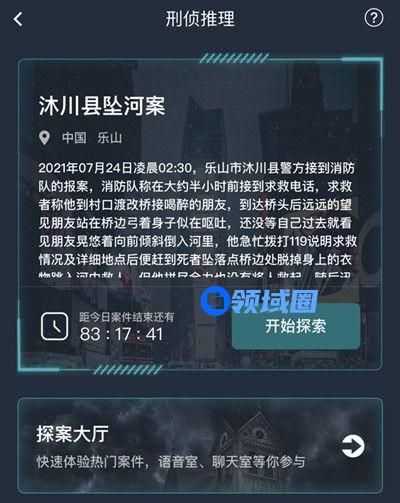 犯罪大师沐川县坠河案答案是什么?沐川县坠河案答案选哪个? crimaster犯罪大师在这两天在刑侦推理板块发布了一个突发案件沐川县坠河案,玩家们开始解谜了吗,凶手的身份大家猜到了吗,玩家在游戏中可以寻找线索,将所有的线索理清思路,接下来就和小编一起来看看犯罪大师沐川县坠河案真相答案吧。,