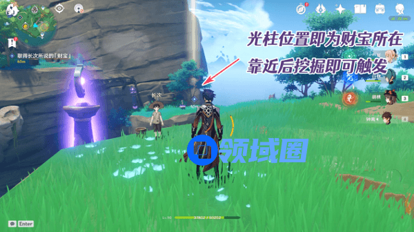 跟随任务指引会出现光柱,来到藏宝处,靠近灌木丛即可调查挖出宝藏,可挖出来的,不是宝箱、不是财宝,仅仅是一个苹果、一根胡萝卜,害的派蒙直唿上当!气冲冲地就拉着旅行者回去质问长次。