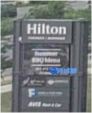 当我们将图一放大时可以发现左边的标牌上有一个英文单词:Hilton(希尔顿),由此推测图一的棕黄色联排建筑为希尔顿酒店。