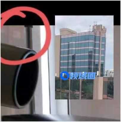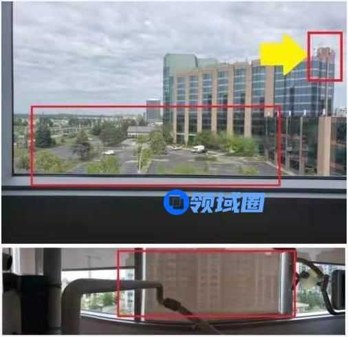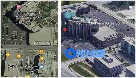 图一左侧都为空场地带,看不到较高建筑,而在图二视角中可见一座高楼,所以推测图二所拍摄到希尔顿酒店的玻璃部分为图一视角右侧部分,且是在这个侧面有棕色顶部的位置,如图所示。