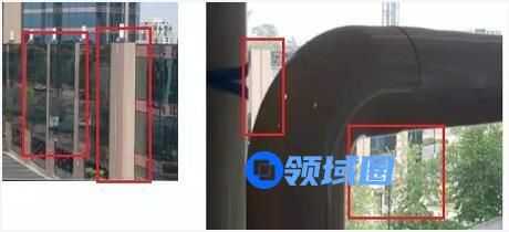 接下来我们观察图二,可以在图片左上角看到一处建筑从上到下依次有三种颜色,大致为棕色、粉色、蓝色,这与图一中希尔顿酒店顶部的外观相吻合,如图所示。