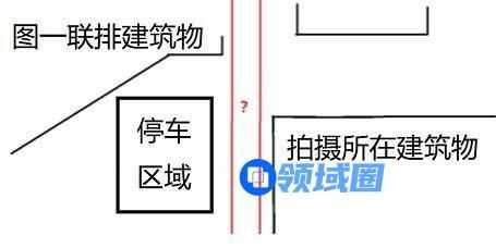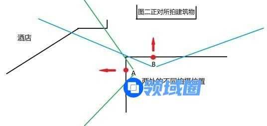 至此我们来推测两张照片的拍摄位置,以及其中所拍摄到的建筑物的位置关系: