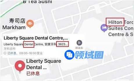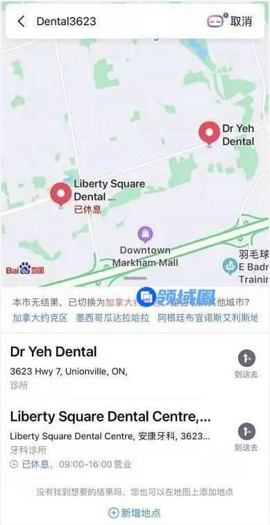 收集好有效信息后我们前往百度地图中输入并将定位视角切换到加拿大安大略省后搜索:DENTAL3623。可以得到两处地点如图所示: