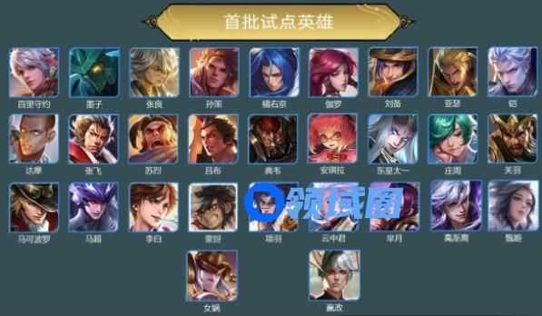 百里守约、墨子、张良、孙策、橘右京、伽罗、刘备、亚瑟、铠、达摩、张飞、苏烈、吕布、典韦、安琪拉、东皇太一、庄周、关羽、马可波罗、马超、李白、蒙�搿⑾钣稹⒃浦芯�、芈月、高渐离、甄姬、女娲、赢政。