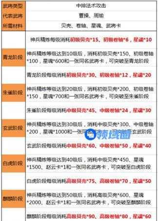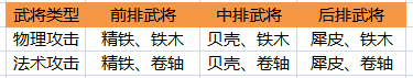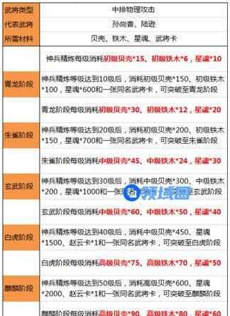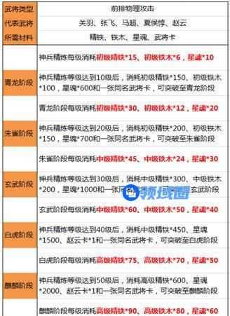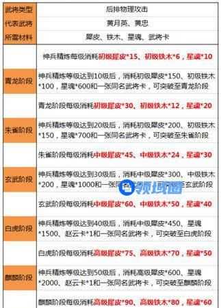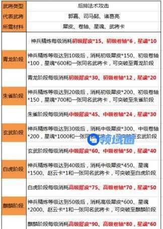 1、图表中的代表武将仅作举例,请根据武将的实际类型(前/中/后排+物攻/法攻)查看神兵精炼材料;