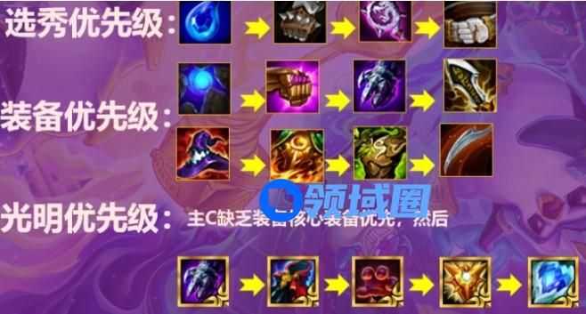 主C卡尔玛:完美神装蓝BUFF法爆无尽, 无尽可以换帽子,但是无尽几乎必秒大多数主C,帽子看脸,卡尔玛极度吃输出装,除了光正义光科技这种不要给恢复装,靠黎明恢复。