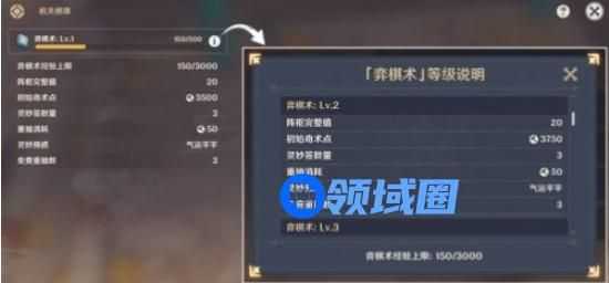 在「棋阵」中完成不同挑战均可获得「弈棋术经验」,提升「弈棋术」等级。升级时「初始原神弈棋术奇术点」等特性也将有所提升,此外还可解锁新的机关与「灵妙签」。
