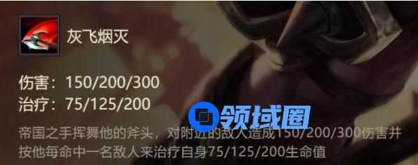 4、技能效果:帝国之手朝目标挥舞他的斧头,1星时、2星时、3星时沿直线对两名敌人分别造成150、200、300伤害并且回复自身生命值75/125/200。(如下图所示)