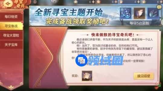 活动期间登录即可接见信使一次,接见信使后可获得辽东藏宝图*1,可用于寻宝大冒险!接见信使后,开启寻宝备战任务。每日完成组队讨伐、家园互动、群雄逐鹿等玩法条件即可获得辽东藏宝图碎片及元素碎片、随机一阶灵石等奖励。