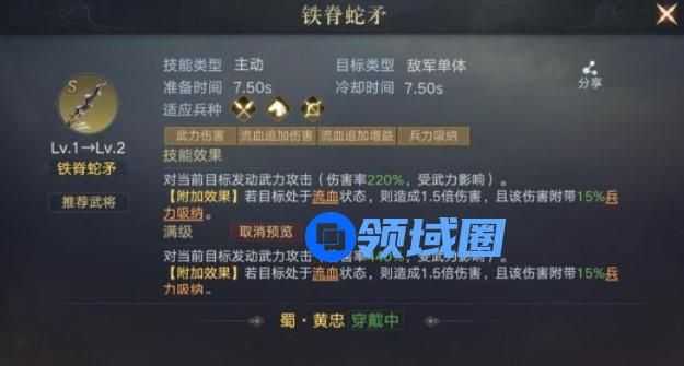 对当前目标造成武力伤害。若目标处于流血状态 ,则造成1.5倍伤害, 且该伤害附带15%兵力吸纳 。适合搭配造成流血状态的武将 如庞德 黄忠等。