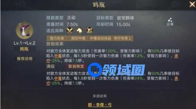 对敌方全体造成智力伤害,并有40%几率使敌方中毒,且承疗-25%。中规中矩 ,万金油宝物,常用于搭配奇策集。较为克制以刘备为主的阵容。