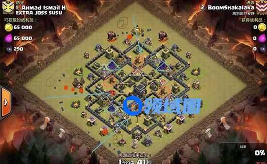 对面的双王才是初九的等级,但X弩、法师塔、迫击炮、加农炮和电塔都已达到满九。所以这次就选择直接丢狗球进去,如果女王等级较高,而当自己女王也较高是,可以选择天女,但要注意时间。
