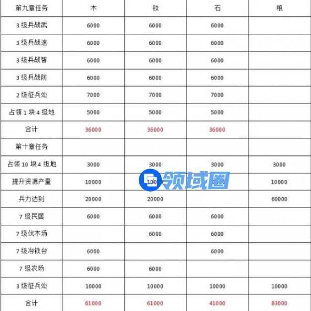 10级兵营需要91w石头,45.5w铁、木。1级帅令坛需要5W铁、木和10W石头;2级帅令坛需要10W铁、木和30W石头;3级帅令坛需要30W铁、木和90W石头。