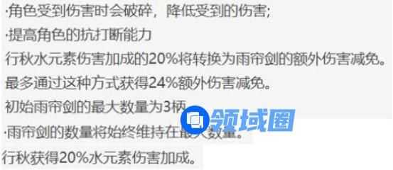 行秋在大招期间会提高抗打断能力,并全程获得伤害减免,减伤比例基础最高29%,理论总共29%+(46.6+15+20)*20%=45.32%,非常恐怖。雨帘剑碎裂或者结束可以为场上角色回复最少24%生命值。