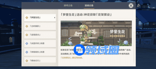 活动期间,旅行者可使用「�D耶」周围的「花架摆设」预览「梦里花」的搭配效果,也可通过「�D耶的特别园艺搭配包」中自选的「花架摆设」在「尘歌壶」中进行搭配。